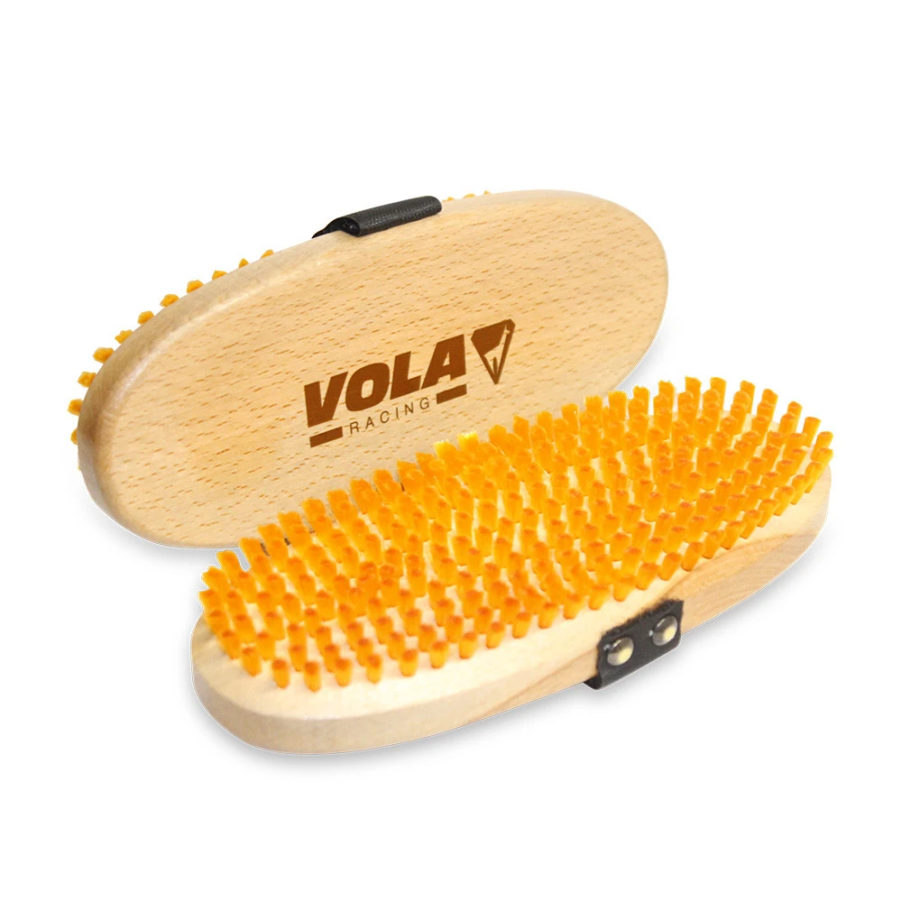 La brosse doit être utilisée parallèlement au ski et le brossage se fait de la spatule vers le talon en faisant plusieurs passages pour enlever le fart restant et faire ressortir la structure